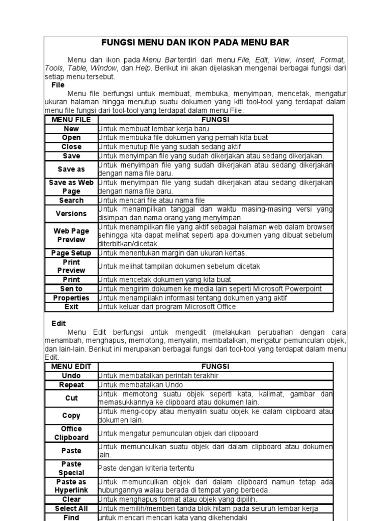 Semua orang yang biasa menggunakan komputer pasti sudah tidak asing lagi dengan 1. Pada kali ini saya akan berikan tabel fungsi menu dan ikon microsoft word, langsung simak di bawah ini: Di postingan ini, andronezia akan memberikan informasi mengenai fungsi menu pada microsoft word. Silahkan baca dengan teliti supaya kamu nantinya dapat mengoperasikan ms word lebih baik lagi dari sebelumnya. Cut, untuk memotong dan menyimpan pada clipboard paste, untuk memunculkan hasil dari perintah copy dan cut microsoft word help, untuk menampilkan bantuan penggunaan microsoft word